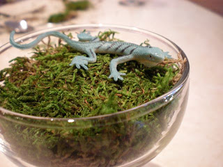 These are the supplies Kathryn and I used. The dessert glasses were found at a second hand store, the lizards I found at the dollar store, and the moss is from Joann's.